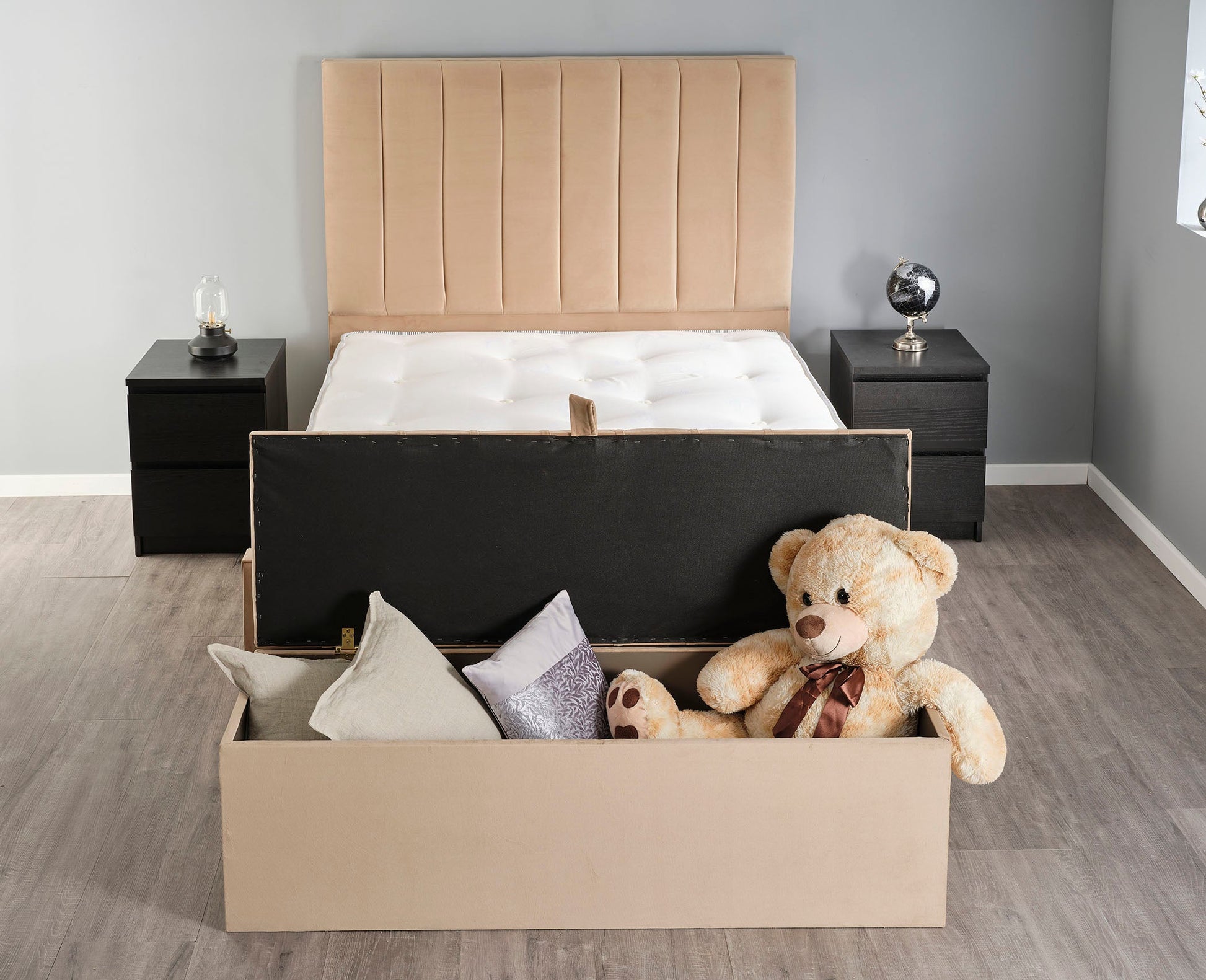 The ottoman storage boxes dimensions are – Height: 43cm, Depth: 45cm, Width – (90cm, 140cm, 152cm, 183cm) A range of sizes are available to cater to the size of your bed or room size.