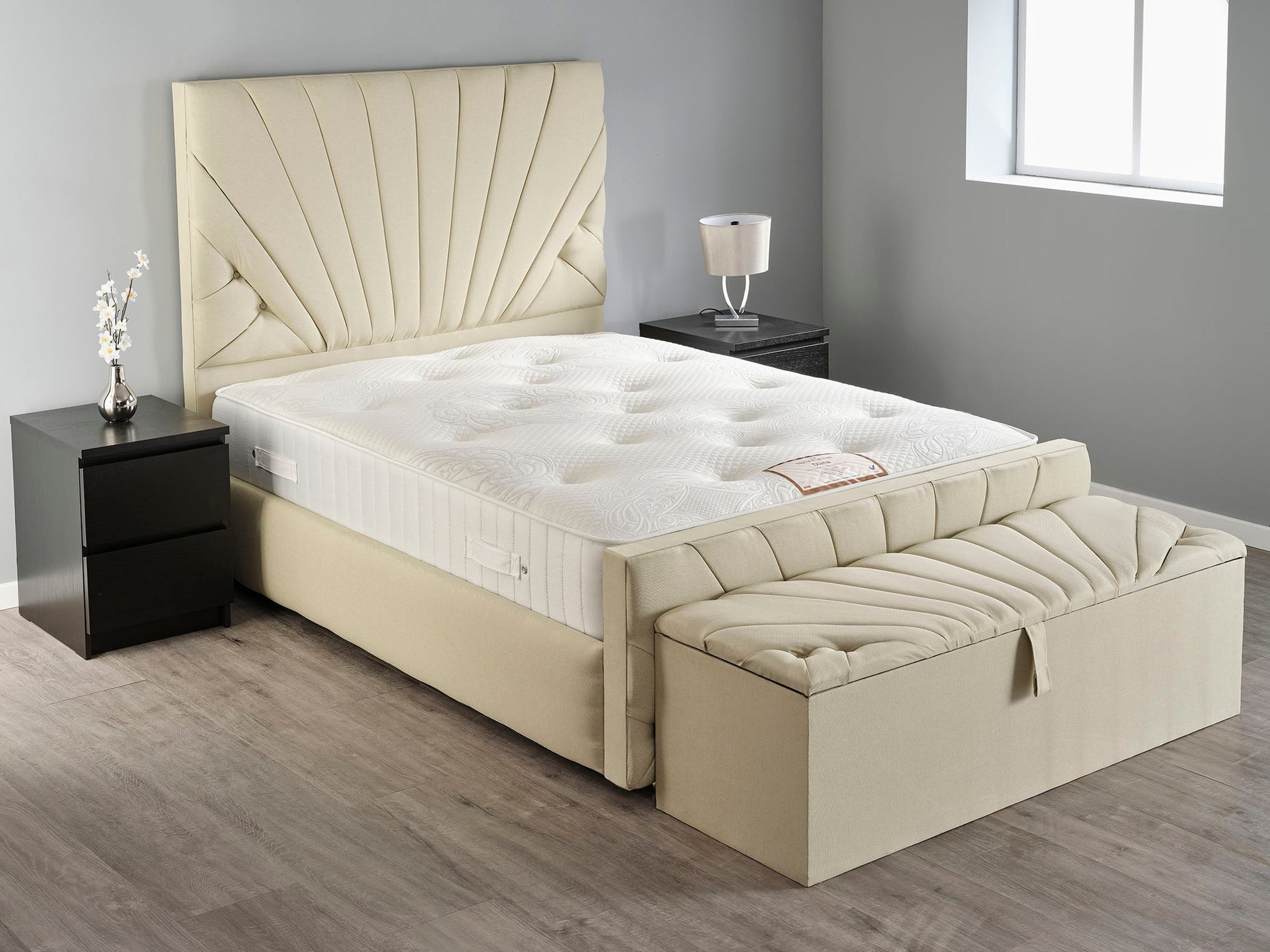 The ottoman storage boxes dimensions are – Height: 43cm, Depth: 45cm, Width – (90cm, 140cm, 152cm, 183cm) A range of sizes are available to cater to the size of your bed or room size.