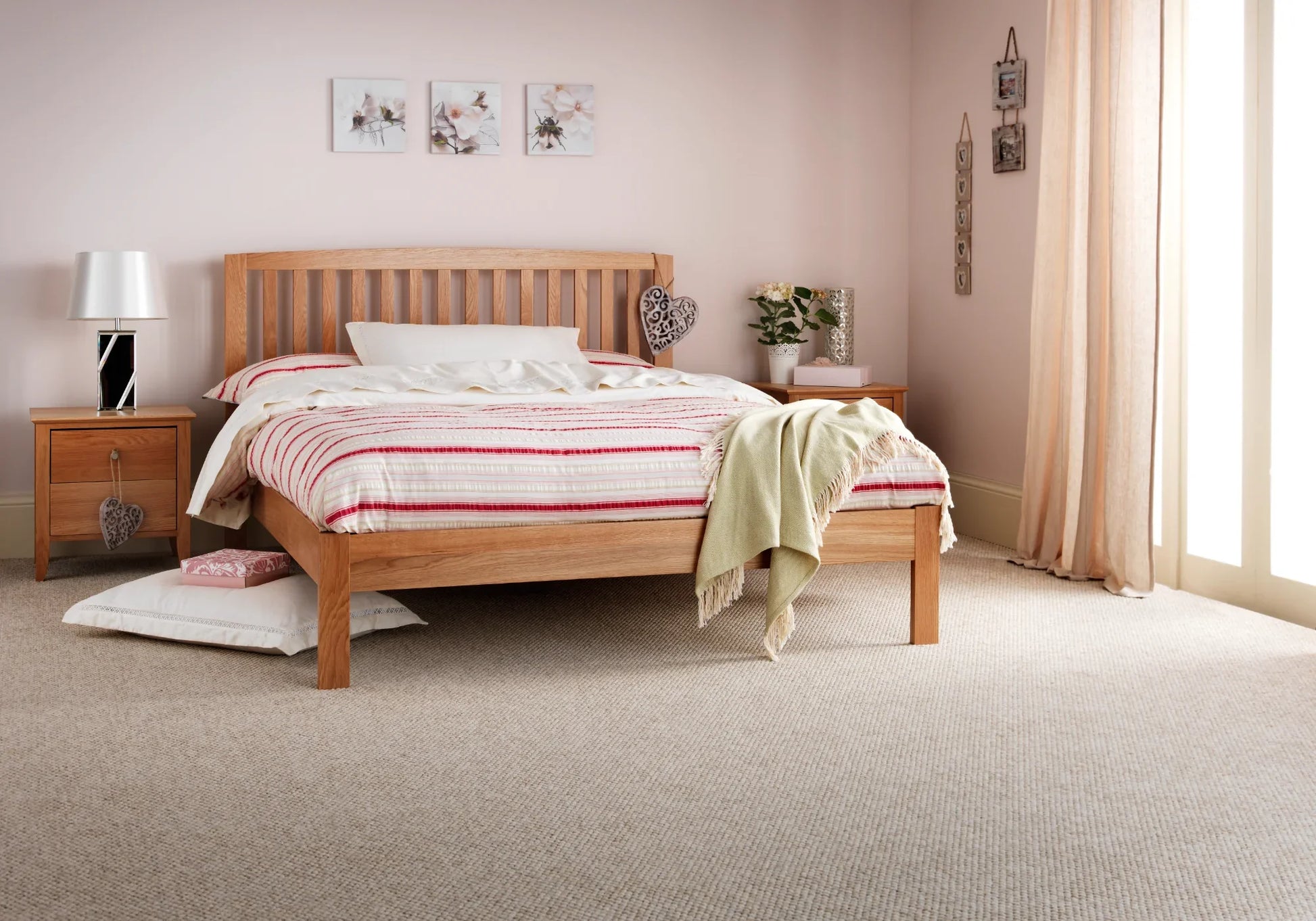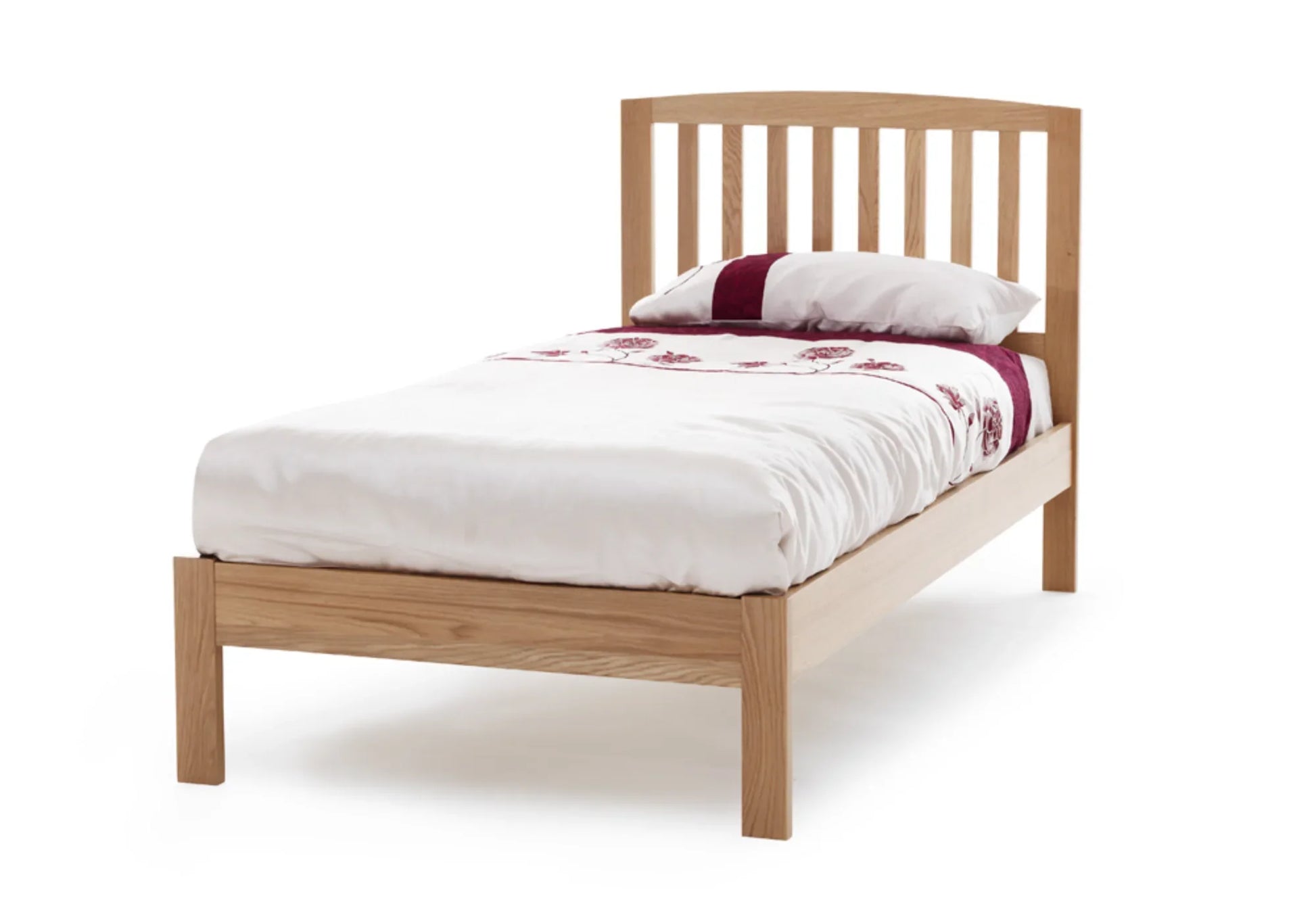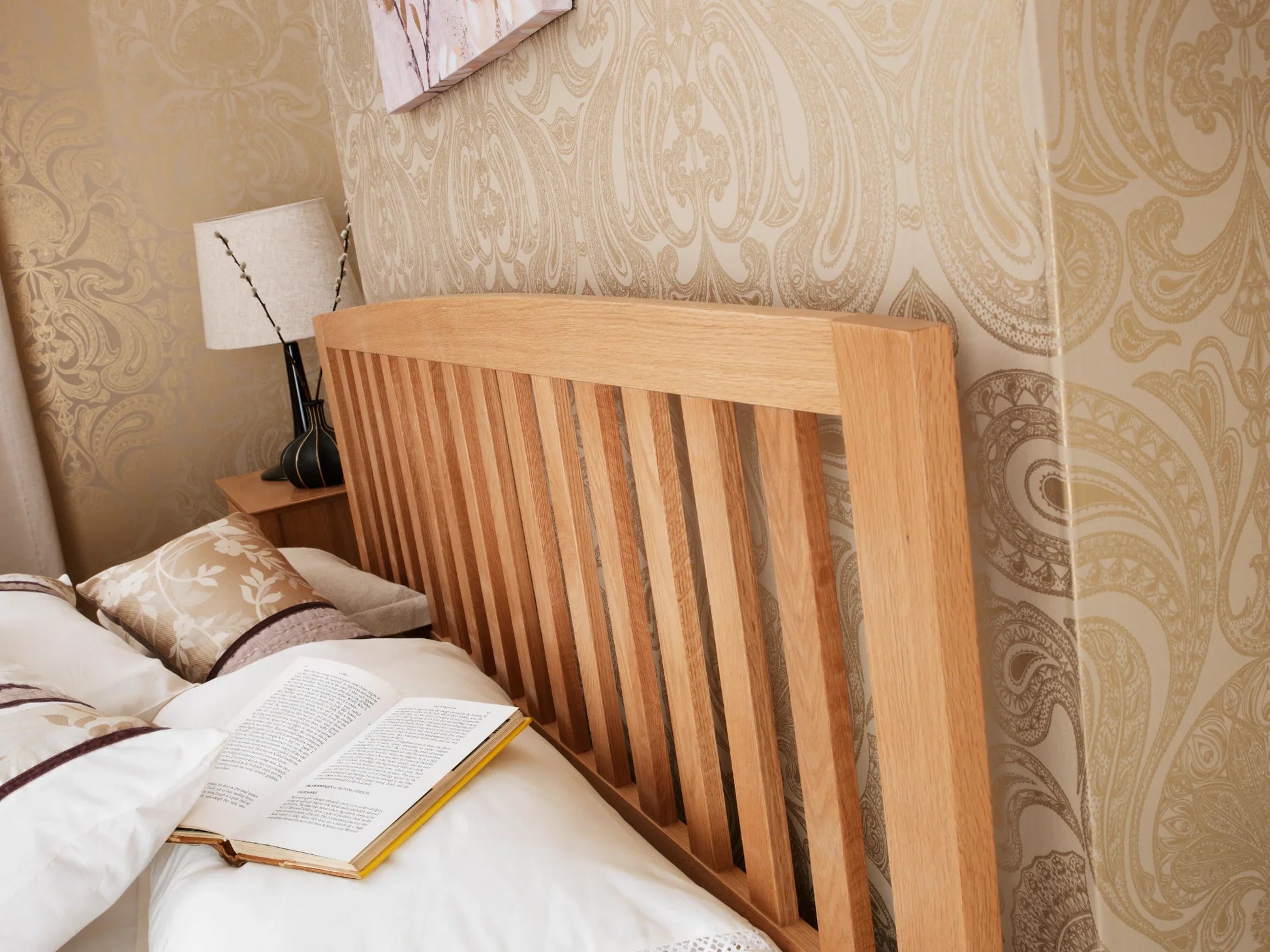 Introducing the Serenity oak bed frame. Crafted from eco-friendly American solid white oak, this chic and contemporary bed frame enhances your bedroom ambiance. Available in single, double, queen, or super king sizes, it offers optimal comfort with a posture-sprung slatted base. With its unique design combining subtle curves and sharp lines, the Serenity bed frame adds charm to your bedroom. Experience tranquility and beauty as it transforms your space into a relaxing haven.